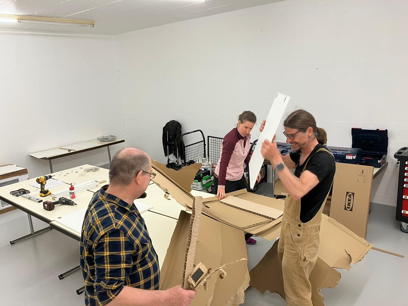 Nach einem Aufruf im Member Chat, haben sich viele helfende Hände gemeldet um die Küche zusammen zu setzen, Gitterboxen zu montieren, Wasser und Abwasser zu installieren, Kabel zu verlegen und weitere kleine aber wichtige Arbeiten zu erledigen.